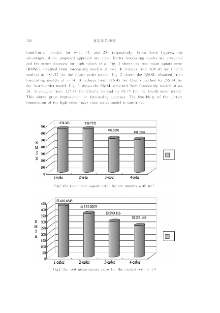 Due to there are no evidences and any implementation to confirm the advantages of the high-order model in the literature, the same example of the historical enrollments in the University Alabama shown in Song and Chissom (1993, 1994) are analyzed using four different models (include the first-order, second-order, third-order, fourth-order models) with different numbers of partition n (n=7,14 and 28). In figures 1-3, the RMS error obtained from results of the first-order, the second-order, the third-order or the