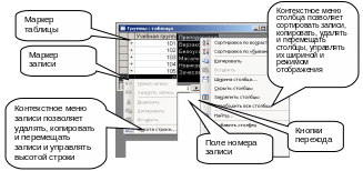 Щелчок на заголовке столбца выделяет весь столбец, а щелчок правой кнопкой на выделенном столбце открывает контекстное меню. В нем есть очень интересные пункты, позволяющие отсортировать записи по данному полю, вставить новый столбец, скрыть столбец и прочее.