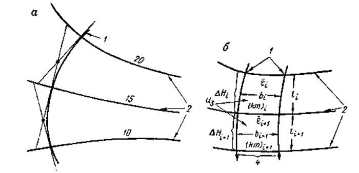 Схемы к построению гидродинамической сетки:а — построение линий тока; б — фрагмент гидродинамической сетки; 1 — линии тока; 2 — гидроизогипсы; 3 — ячейки сетки; 4 — полоса тока