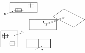 1-Промышленный робот.2-стол монтажный с шаблонами.3-тара с деталями.4-устройство управлени ПР.