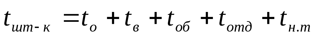 где tо — основное время; tв — вспомогательное время; tо + tв = tоп -оперативное время; tоб — время обслуживания рабочего места (время организационного обслуживания tорг плюс время технического обслуживания tт.о); tотд — время на отдых и личные надобности; tн.т — время неустранимых перерывов, предусмотренных технологией и организацией производственного процесса.