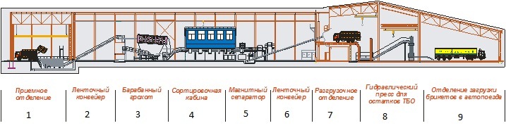 9- Отделение для загрузки брикетов в автопоезда. Транспортировка брикетов производится автопоездом на шасси МАЗ грузоподъёмностью до 26 тонн.