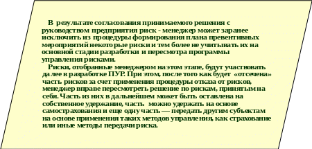 Но(!) необходимо помнить, что даже после этого все же могут («Семь раз отмерь..."» остаться риски с любыми значениями основных характеристик — вероятности наступления убытка, размера возможного ущерба, однородности и количества аналогичных рисков и др. Поэтому проблема управления рисками остается, т. е. остается проблема доработки программы управления рисками (первая часть разработки ПУР — план превентивных мероприятий — уже сформирована).