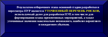 - •По результатам этапа «Предварительный отбор рисков» оставлены для рассмотрения только те риски, которые согласуются с принятой стратегией хозяйствующего субъекта по управлению ими.