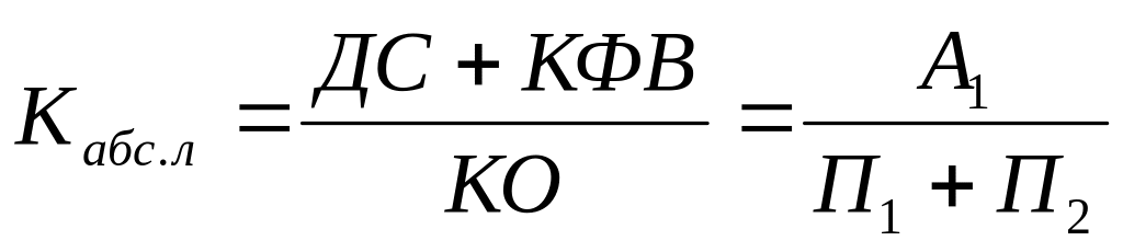 1. Коэффициент абсолютной ликвидности показывает какая часть краткосрочных обязательств может быть покрыта за счет денежных средств и их эквивалентов, т.е. за счет краткосрочных финансовых вложений: