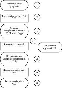 C – compile – компилятор в качестве транслятора – служит для получения из ASCII кода объектного файла, т.е. кодирование в двоичные коды команд (объектные коды), а также подключает библиотеки. Компилятор транслирует программу сразу целиком, и лишь после этого возможно ее выполнение. Интерпретатор же - это более простой транслятор, он последовательно транслирует операторы программы и так же по частям ее выполняет.