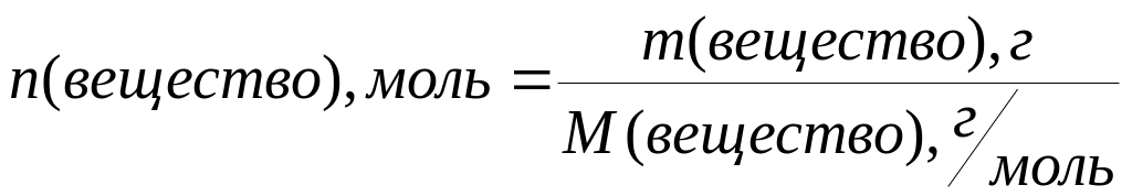 Массу одного моль вещества легко рассчитать, если известна химическая формула вещества, так как численно масса одного моль совпадает с молекулярной массой, например, масса 1 моль N2 равна 28 г. Число структурных единиц в одном моль составляет 6,02∙1023 частиц. Данное число называется постоянной Авогадро (NA). Поскольку формулы разных веществ разные, то и один моль разных веществ будет иметь различную массу. Масса вещества и количество вещества связаны следующим соотношением:
