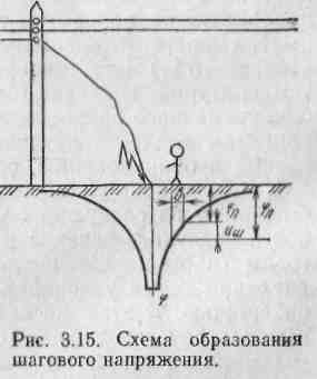 Чем больше величина шага и чем ближе человек находится к месту прикосновения провода к земле, тем больше величина напряжения шага и больше опасность поражения. Особую опасность напряжение шага представляет для сельскохозяйственных животных, и в первую очередь для крупного рогатого скота и лошадей, так как у них расстояние между передними и задними ногами значительно больше, чем расстояние между ногами человека.