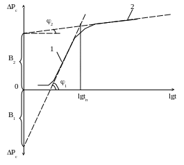 Обработка КВД и определение по ним коллекторских свойств пласта проводятся следующим образом. Снятую манометром КВД после остановки скважины перестраивают в полулогарифмических координатах - Р(lgt). На фактических КВД обычно четко выделяются два прямолинейных участка, первый из которых (1) характеризует призабойную зону, а второй (2) – удаленную зону пласта.