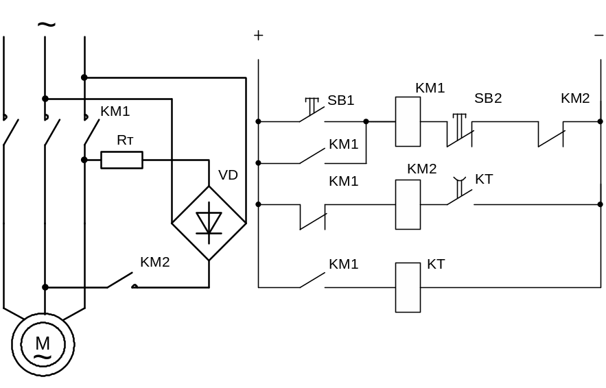 Схема должна работать таким образом, чтобы реле KV разорвало свой контакт в цепи КМ2 раньше, чем произойдет замыкание контакта КТ. Таким образом контактор КМ2 в процессе рабочего режима электропривода остается отключенным.