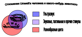 Мы, жалкие ничтожные людишки, чтобы самоутвердиться, считаем себя царями природы, венцами творениями и идеальными животными. Когда животные что-то не умеют, а мы умеем, то смотрим на них снисходительно, как на недоразвитых по сравнению с нами. Как говорил Артемий Лебедев «Вы ведете себя как типичный дизайнер в нашей стране — вам что-то показалось, и вы решили, что это неебически крутая мысль, за неврубание в которую все объявляются идиотами». Вот так же и с учеными. Им и в голову, зачастую, не приходит мысль, что животные могут уметь что-то, что не умеем мы. Ученые 150 лет не могли понять, как ориентируются летучие мыши. Разгадка оказалась не такой уж сложной – ультразвук (100000 колебаний в секунду). Но мы не воспринимаем ультразвук, он не является для нас специфической стимульной энергией, на которую мы реагируем, поэтому даже и в мыслях не было никакого ультразвука. Мы бы скорее предположили, что летучие мыши обращаются к вселенскому разуму путем раскрытия седьмой чакры и обмена энергией посредством Мескалито. Но из-за того, что мы можем воспринимать одни стимулы, а животные – несколько другие, зоопсихология порой тормозит до ужаса. Поэтому Якоб фон Юкскюль вводит понятие die Umwelt – та часть мира, которую животное способно воспринимать и на воздействие которого оно способно реагировать. Метафорически умвэльты можно изобразить такими кружочками: