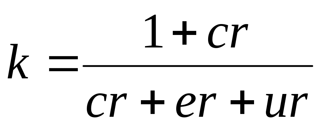 Если денежная масса (М) измеряется агрегатом М1, то денежное предложение изменяется в результате как денежной, так и кредитной эмиссии, так как в денежную базу (Н) в этом случае входят не только наличные деньги (С), но и резервы (RR). Влияние денежной базы на предложение денег в этом случае выражается в денежном мультипликаторе (k)