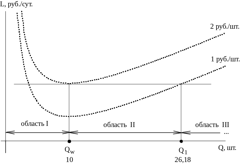 Поскольку объем заказа, задаваемый формулой Уилсона, легко определяется зрительно как точка минимума обеих функций, то без предварительных вычислений графически находим объем Уилсона и отмечаем его на графике.