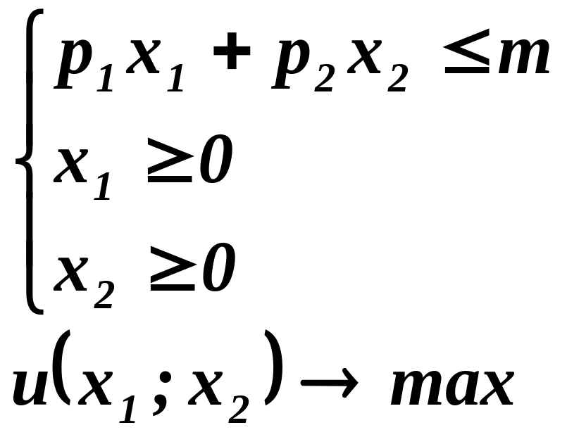 где р1 – цена 1го товара; р2 – цена 2го товара; m – доход потребителя; х1- объем потребления 1го товара; х2 – объем потребления 2го товара