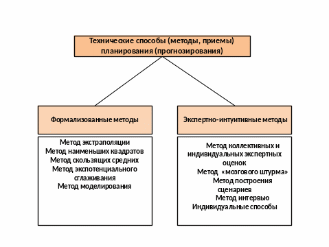 К таким способам и приемам относятся: экстраполяция, методы экспертных оценок, включая «мозговой штурм», метод Дельфи, метод экспотенциального сглаживания, метод наименьших квадратов, метод скользящих средних и другие.