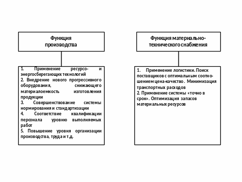 По функции производства основными направлениями снижения затрат на материальные ресурсы являются: применение ресурсосберегающих технологий, внедрение нового прогрессивного оборудования, снижающего материалоемкость изготовления продукции, соответствие квалификации персонала уровню выполняемой работы, улучшение организации производства и труда, совершенствование системы нормирования и контроля и т.д.