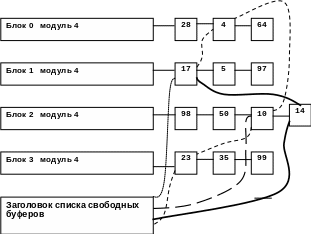 Удаляем из списка свободных буферов ( на рисунке это показано толстой пунктирной линией ).