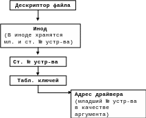 Для работы с блочными используются команды open, close, read, write. А для работы с символьными ioctl ( для вызова ). Создаются файлы командой mknod :