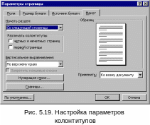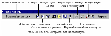 Для установки колонтитулов необходимо ввести команду Колонтитулы из меню Вид. При этом открывается второй слой документа, а основной текст становится недоступным для редактирования. Одновременно на экран выводится панель инструментов для управления колонтитулами (рис. 5.20). При выводе на печать и основной текст и колонтитулы отображаются одинаково.