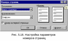При выборе в списке “Выравнивание” параметра Снаружи или Внутри автоматически устанавливаются зеркальные поля. Флажок “Номер на первой странице” рекомендуется снять, так как на первой странице документа номер страницы обычно не ставят.