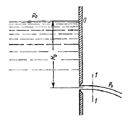 Рассмотрим большой резервуар с жидкостью под давлением Р0, имеющий малое круглое отверстие в стенке на достаточно большой глубине Н0 от свободной поверхности (рис.5.1).
