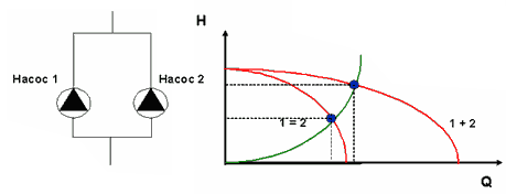 Параллельной работой насосов называется одновременная подача перекачиваемой жидкости несколькими насосами в общий напорный коллектор. Необходимость в параллельной работе нескольких одинаковых или разных насосов возникает в тех случаях, когда невозможно обеспечить требуемый расход воды подачей одного насоса. Кроме того, поскольку водопотребление в городе неравномерно по часам суток и по сезонам года, то подачу насосной станции можно регулировать числом одновременно работающих насосов.