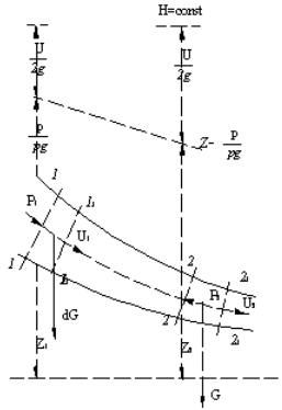 Выделим двумя нормальными к линиям тока сечениями 1 - 1 и 2 - 2 отсек жидкости, который будет находиться под действием сил давления P1 и P2 и сил тяжести dG.