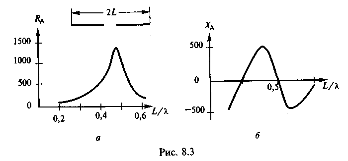 Рис. 10.3. Характеристики входного сопротивления антенны типа горизонтальный вибратор