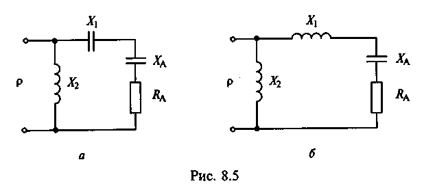 Из (10.6) следует, что для полной передачи мощности из фидера в антенну необходимо иметь коэффициент отражения нагрузки ГА=0. Для выполнения условия, близкого к ГА=0, между антенной и фидером включается согласующее устройство, составленное из реактивных элементов (рис. 10.4,б). Назначение согласующего устройства состоит в преобразовании комплексного сопротивления антенны ZA в активное величиной Rвх.с=. Две возможные схемы согласующего устройства при емкостном характере сопротивления антенны приведены на рис. 10.5. Входная комплексная проводимость схемы (рис. 10.5,а):