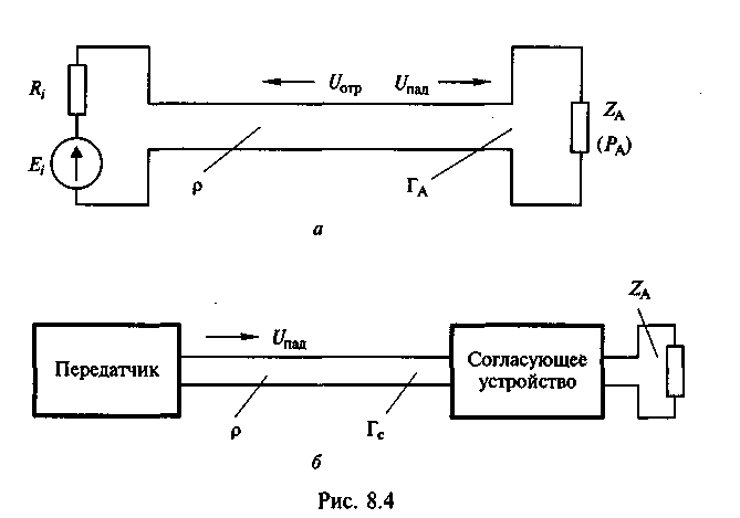 Оптимальное согласование передатчика с антенной означает передачу номинальной мощности выходного каскада радиопередатчика - ГВВ - в активную составляющую RА(f). Выполнение данного условия осложняется тем, что антенна связана с передатчиком фидером. Потери, связанные с передачей мощности от передатчика в антенну обусловлены двумя активными потерями в фидере: B=Lb, где L - длина фидера, м; b - потери на один метр, дБ/м и отражением сигнала от антенны. Для снижения первой составляющей потерь следует по возможности выбирать фидера с минимальными потерями и уменьшать его длину. Вторая причина потерь связана с отражением сигнала от антенны. В фидере, соединяющем генератор с нагрузкой (рис. 10.4,а), распространяются две волны: падающая с комплексной амплитудой Uпад и отраженная от нагрузки с амплитудой Uпад, Количественно этот процесс оценивается с помощью коэффициента отражения: