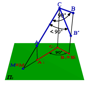 1. Если хотя бы одна из сторон прямого угла параллельна плоскости проекций, а другая не перпендикулярна ей, то на эту плоскость прямой угол проецируется без искажения (Теорема о проецировании прямого угла).