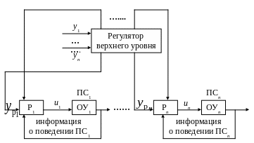 Система управления проектом состоит из подсистем – ПС1, ПС2, …, ПСn, каждая из которых располагает своими объектами управления – ОУ1, ОУ2, …, ОУn, т. е. коллективом непосредственных исполнителей, и своим регулятором первого уровня – Р1, Р2, …, Рn, т. е. руководством подсистемы.