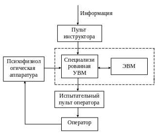 Испытательный пульт оператора представляет собой перестраиваемую конструкцию, построенную с использованием модулей индикации и органов управления и позволяющую изменять состав и расположение как устройств отображения информации, так и органов управления. Специализированная УВМ служит для имитации технической части проектируемой человеко-машинной системы управления. ЭВМ обеспечивает обработку информации, получаемой в процессе эксперимента, и оценку основных характеристик проектируемой человеко-машинной системы управления.
