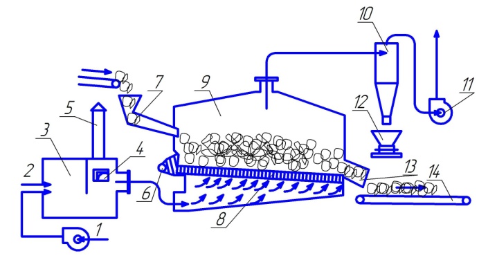 1- подача воздуха на горение; 2 - подача топлива; 3 - топка; 4- окно для подачи воздуха; 5 - аварийная труба; 6 - вибропривод решетки; 7 - питатель; 8 - решетка; 9 - сушильная камера; 10- циклон; 11-отсасывающий вентилятор; 12 - вагонетка для выгрузки уносов; 13 - выгрузка продукции; 14 — конвейер