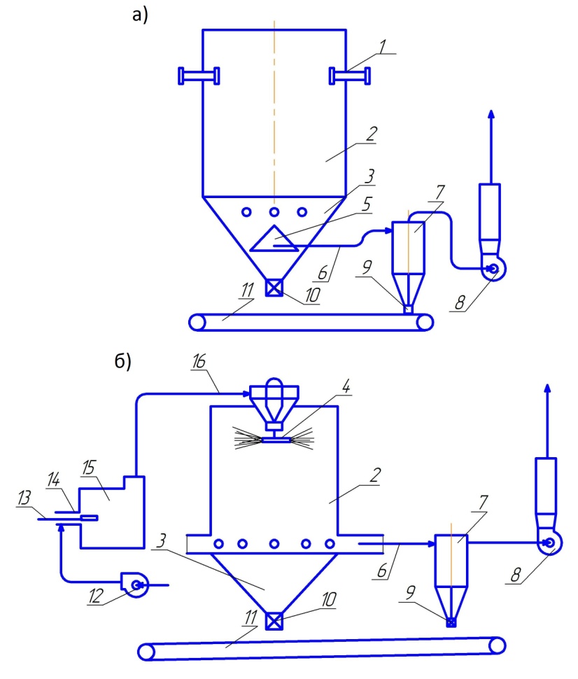 а - с механическими форсунками распыления шликера; б - с дисковым распылением шликера; 1 - распылительные форсунки; 2 - металлический корпус; 3 — конусное днище; 4 - распылительный диск с приводом; 5-защитный зонт; 6 - трубопровод отбора продуктов горения; 7- циклон; 8 - вентилятор; 9 - мигалка для выгрузки порошка из циклона; 10 - челюстной затвор для выгрузки продукции; 11- конвейер отбора готовой продукции; 12- подача вторичного воздуха в топку; 13 - подача газа и первичного воздуха в горелки; 14 - горелки для сжигания газа; 15 - выносная топка; 16 - короба для подачи сушильного агента