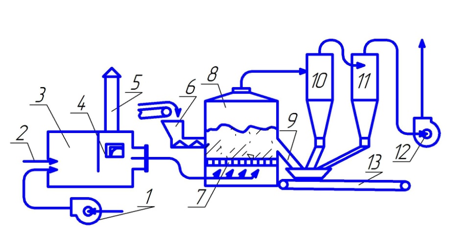 1- вентилятор подачи воздуха на горение; 2 -подача топлива; 3 -топка; 4 - окно для подачи воздуха; 5 - аварийная труба; 6 - бункер с питателем подачи материала; 7 - решетка; 8 - сушильная камера; 9 - выгрузка продукции; 10 - циклон; 11 - батарейный циклон; 12 - отсасывающий вентилятор; 13 - конвейер готовой продукции