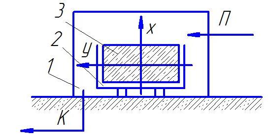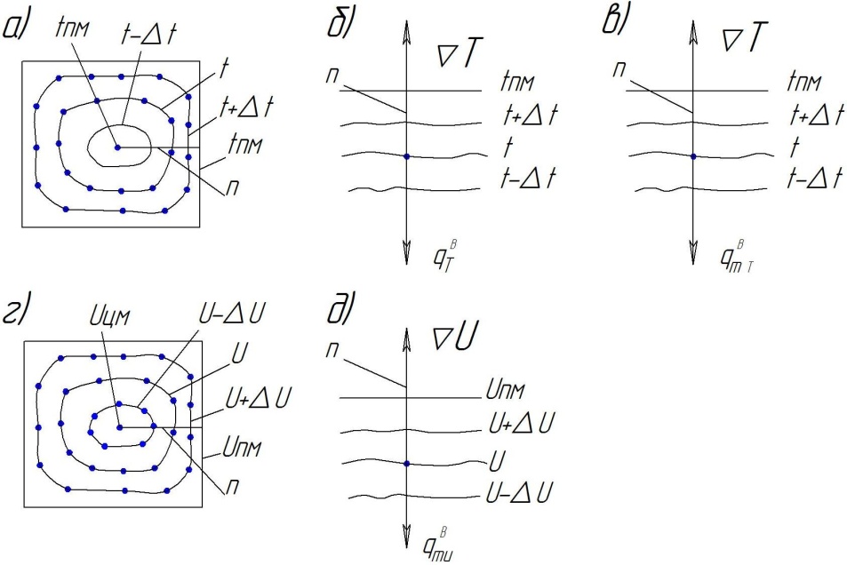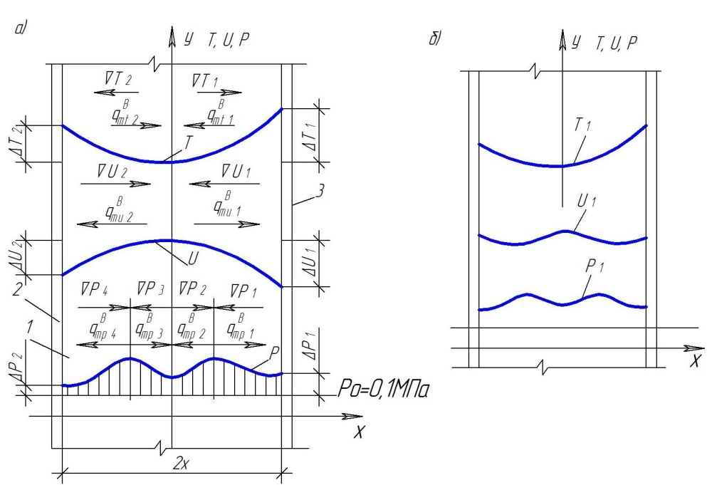 1 - материал; 2 - днище формы; 3 - крышка формы; U, Т, Р - кривые распределения влагосодержания, температуры и давления по материалу; ∇U, ∇T, ∇P - направление векторов градиентов; qmt, qmu, qmp -направление векторов частных потоков массы; Т1, U1, P1-действительное распределение влагосодержания, температуры и давления по материалу