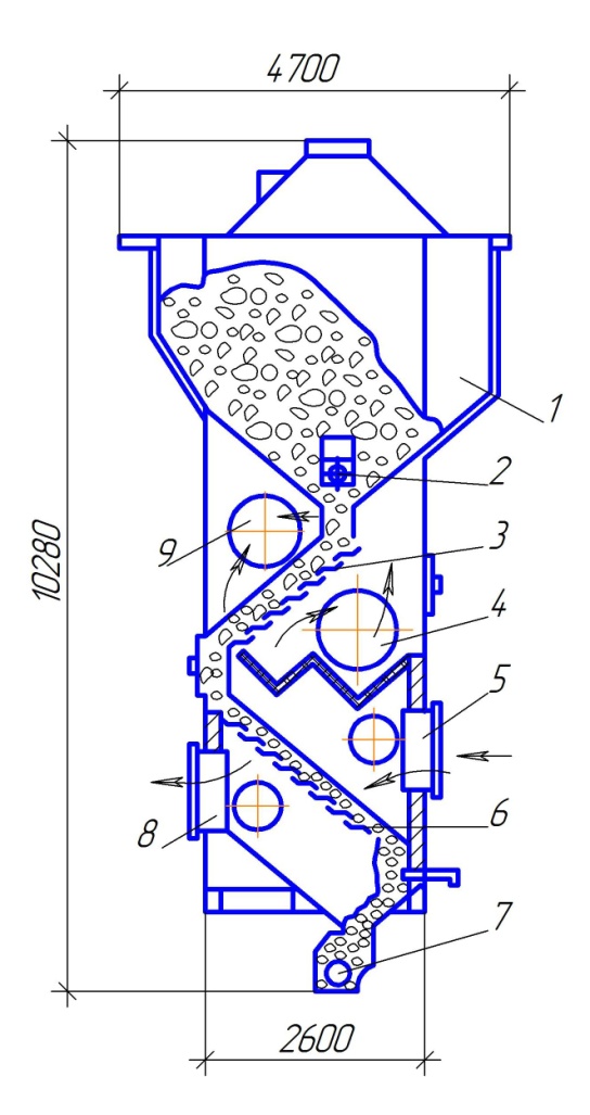 1 - приемный бункер; 2 - решетка для задержки сваров; 3 - противосваровое дутье; 4,5 - колосниковые решетки; 6 - барабанный разгружатель; 7 - бункер просыпи; 8 - фланец для подвода охлаждающего воздуха