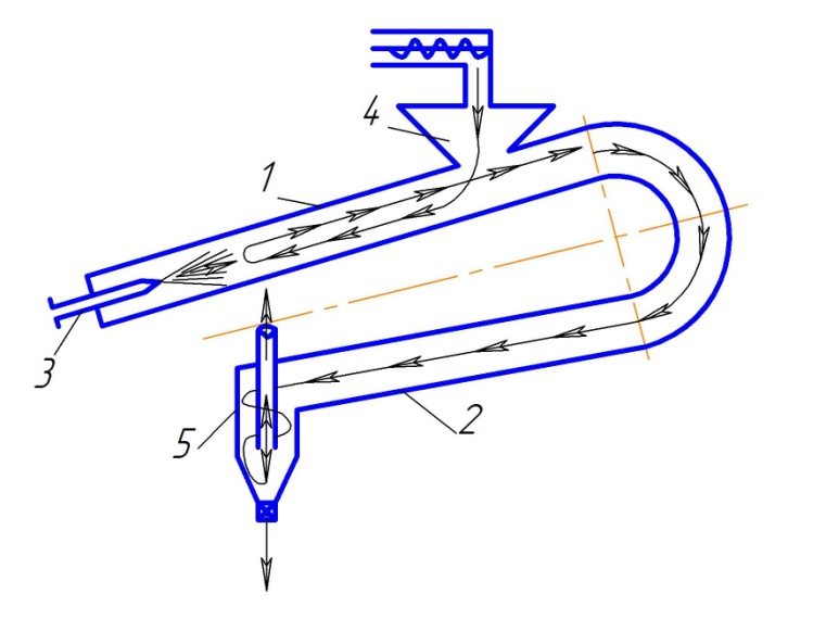Оригинальный тепловой и технологический принцип осуществлен в U-образной печи ЛИСИ (рис. 4.56). Рабочей камерой печи являются две наклонные трубы 1 и 2, сочлененные полукруглой секцией. В торце верхней трубы вмонтирована горелка 3. Материал из загрузочного бункера 4 поступает в месте сочленения верхней трубы с полукруглой секцией. Мелкие фракции, попадая в поток горячих дымовых газов (сплошная линия со стрелками), подхватываются им, вспучиваются и, пройдя закругленную секцию и нижнюю наклонную трубу (пунктирная линия со стрелками), выносятся в циклон 5, являющийся разгрузочной камерой. Более крупные фракции, требующие для вспучивания более длительного времени, из загрузочного бункера скатываются вниз по наклонной тубе 1, и лишь после того, как они вспучатся и приобретут необходимую парусность, смогут удерживаться в потоке газов во взвешенном состоянии, этот поток в прямоточном направлении вынесет их в циклон. В этой печи можно вспучивать нефракционированный материал, что и является ее преимуществом.
