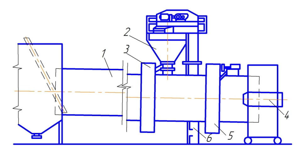 1- вращающаяся печь; 2 - бункер запаса опудривателя; 3 - устройство для ввода опудривателя; 4-горелка; 5 - устройство для ввода вторичного воздуха; 6 - элеватор