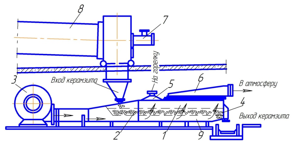 Температура керамзита на выходе из холодильника 60 °С. Холодильник 1 представляет собой сварной металлический короб с перфорированной решеткой 2 для прохода охлаждающего воздуха. Вентилятор 3 нагнетает холодный воздух под решетку, создавая на ней воздушную подушку, по которой движется керамзит. Псевдоожиженный материал охлаждается и перемещается к разгрузочному концу холодильника, а затем поступает на транспортирующее устройство. На выходе из холодильника установлены жалюзийные регуляторы 4, позволяющие изменять высоту слоя и температуру охлаждаемого материала. Отработанный воздух удаляется через имеющиеся в верхней части холодильника зонты. Воздух, отходящий от зонта 5 после очистки его в циклонах дутьевым вентилятором, подается на горелку (форсунку) 7 вращающейся печи 8. Воздух из зонта 6 выбрасывается в атмосферу.
