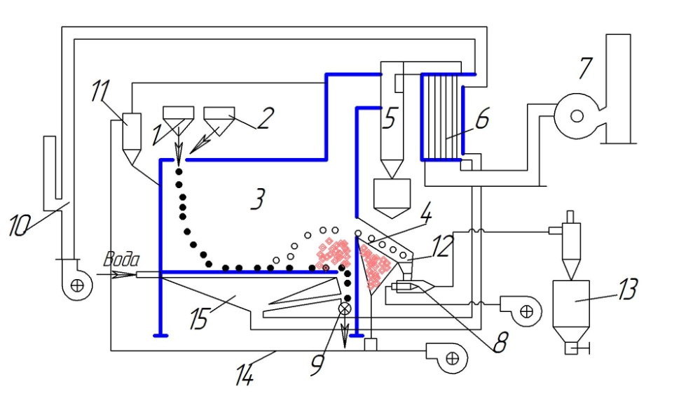 Под действием напора, создаваемого в смесительной камере газовоздушной смесью, твердый теплоноситель — песок, переходит в псевдоожиженное состояние, с большой интенсивностью передает свое тепло обжигаемому материалу — гранулам, которые при этом вспучиваются и всплывают, перемещаясь одновременно вперед по направлению к выгрузочному отверстию 12. Здесь они увлекаются системой пневмотранспорта 8, которая одновременно выполняет функции холодильника, и поступают в бункер готовой продукции 13.