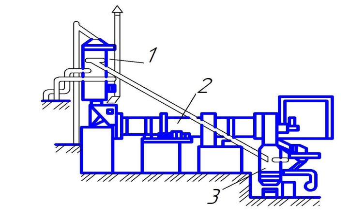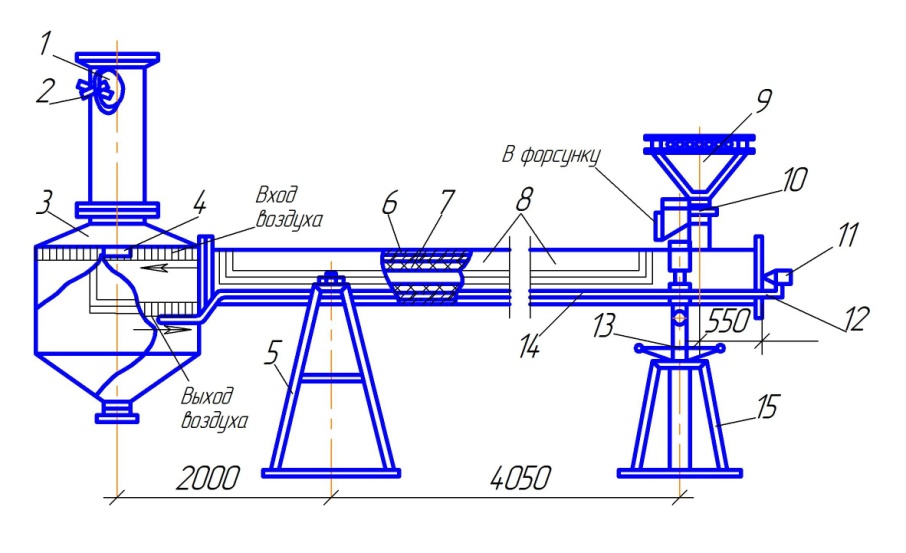 1 - вытяжная труба; 2 - шибер; 3 - циклон; 4 - штуцер; 5, 15 - шарнирные опоры; 6 - теплоизоляционный слой; 7 - футеровка; 8 - съемная крышка; 9 - загрузочный бункер; 10 - питатель; 11 - форсунка; 12, 14 - трубки; 13 - винтовой подъемник