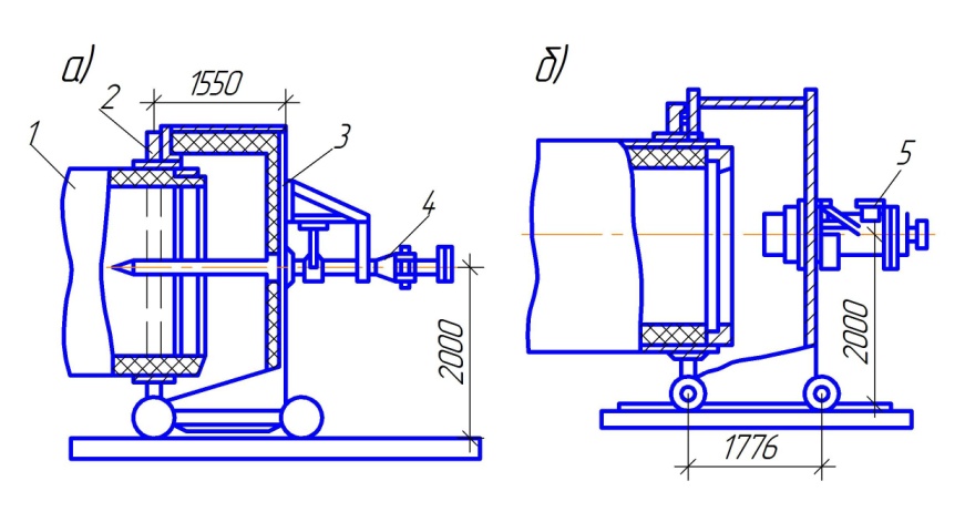 Рис. 4.43. Установка мазутной форсунки (а) и газовой горелки (б) на вращающейся печи