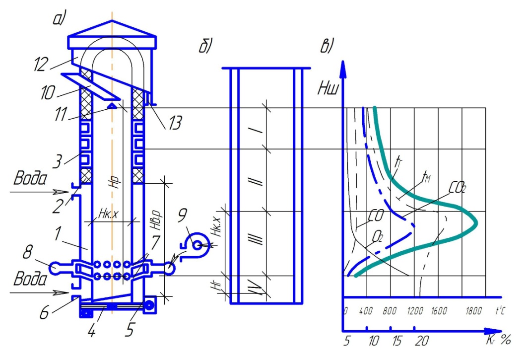 а - конструктивная схема; б - расположение технологических зон; в- изменение концентраций газов и температур по зонам (I - IV); tГ, tМ соответственно температура газов и материала; Нш - высота шахты; НГ - высота горна; Кг - концентрация газов; Нкх - высота холостой колоши; Нр - рабочая высота; Н в.р - высота водяной рубашки