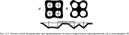 Если сравнивать формы забоя после разрушения породы, то полученные при одновременном и поочередном вдавливании четырех инденторов в породу при одинаковой схеме их расположения (рис. 3.5, а, б), то можно отметить, что при одновременном внедрении инденторов получена лунка разрушения бòльшего объема и более ровная по форме в сравнении с последовательным внедрением инденторов. При этом естественно нагрузка на один индентор при поочередном нагружении равняется ¼ величины нагрузки при одновременном внедрении инден-торов.