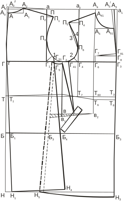 Линия, проходящая через точки Г41', Г41, Т71, в3, в4', Б7 и Н31 – боковая линия полочки. Ее удлиняют с учетом раствора вытачки: