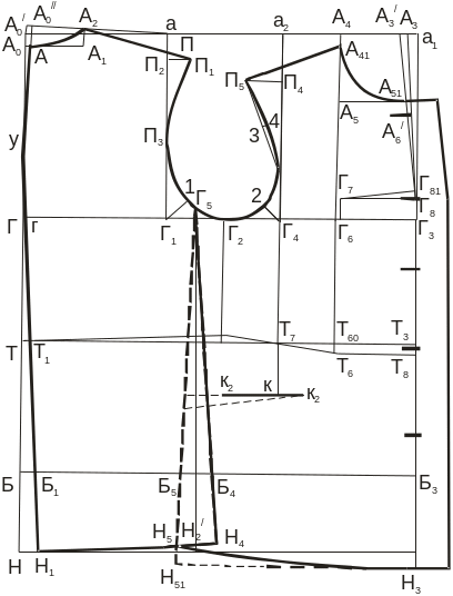 Если полочка с отрезным бочком, то при наличии передней вытачки на полочке влево от точки в3 откладывают величину раствора передней вытачки – точка К3.