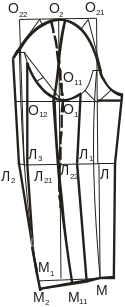 Внешнюю линию передней части рукава проводят плавной кривой через точки О21, О12, Л21, М11, а внешнюю линию задней части рукава – через точки О22, О11, Л22, М11.