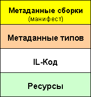 Каждая программная единица в среде .Net, (сборка), помимо кода на языке MSIL обязательно содержит метаданные, описывающие как её в целом (манифест), так и каждый тип, содержащийся в ней, в отдельности (метаданные). На рисунке 1 показаны составные части однофайловой сборки.